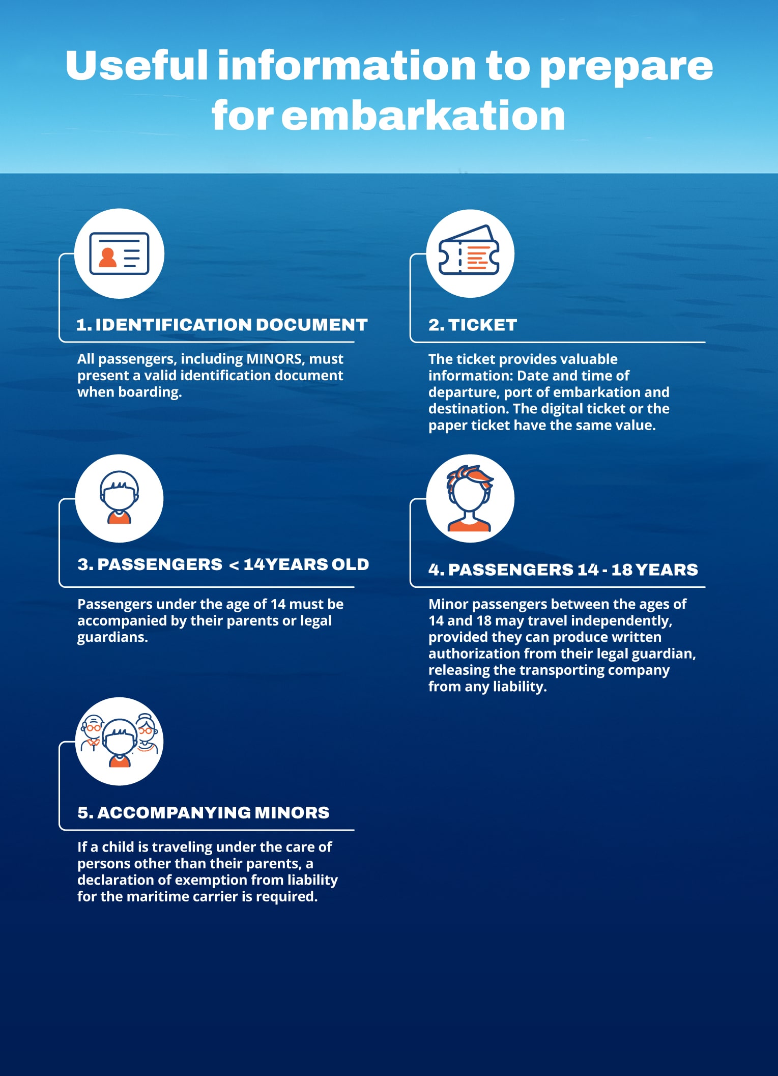 If a child travels under the custody of persons other than his or her parents, a declaration of indemnity must be submitted to the maritime carrier. In this declaration, the parents or those exercising parental authority must indicate the person designated to have custody of the child, who will be liable for all legal purposes. This declaration must be accompanied by a copy of a valid identity document for each declarant.